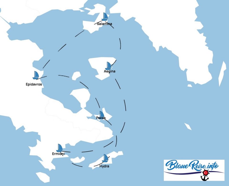 Routenverlauf: Salamina – Epidavros – Poros – Hydra – Ermioni – Aegina – Salamina