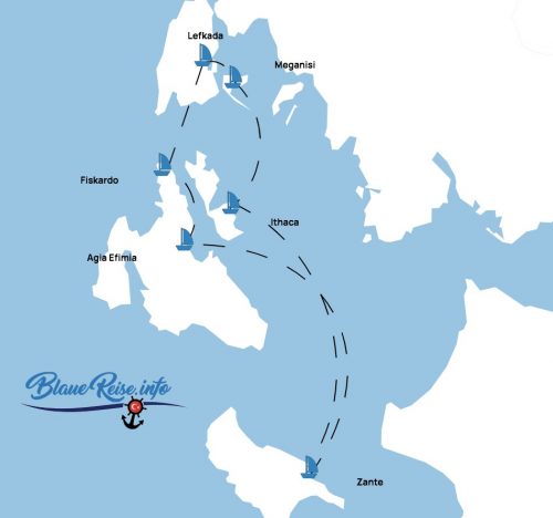 Zante – Agia Ethimia – Fiskardo – Lefkada (Nidri) – Meganisi – Ithaca (mit Atokos stop) – Zante